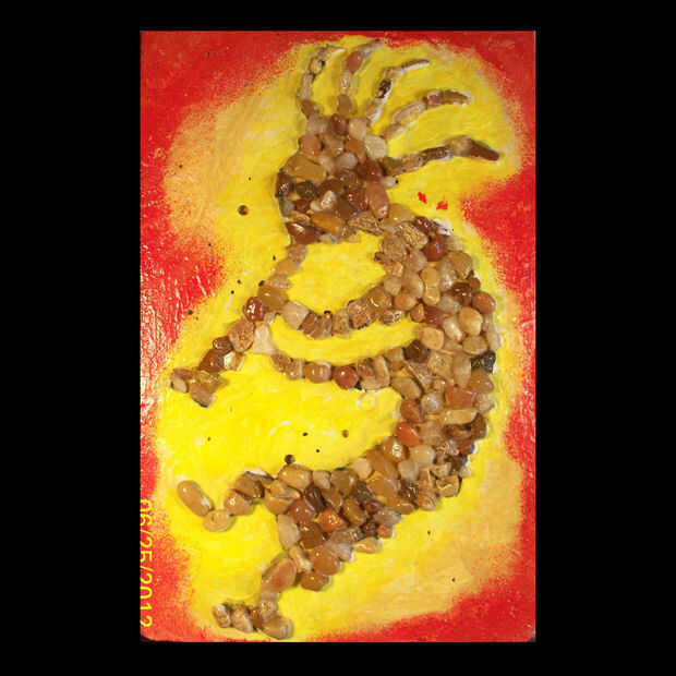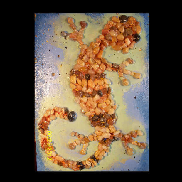Para la planta de pie #1, quería usar vidrios de colores y eligió a un lagarto y kokopelli como mis temas. La liazrd y kokopelli fue ejecutado entonces en piedras como se muestra. Después de completar el proceso de encolado, dejar secar y proceda a pintar los alrededores en colores de su elección. Cuando se seca, se sella toda la superficie con varias capas de poliuretano brillante, a base de agua. Incluso con riego a través de los años y por supuesto, la lluvia, estos proyectos deben durar un tiempo muy largo. Han tenido acabados duró 15 años, pero se rehace cada ahora y entonces.