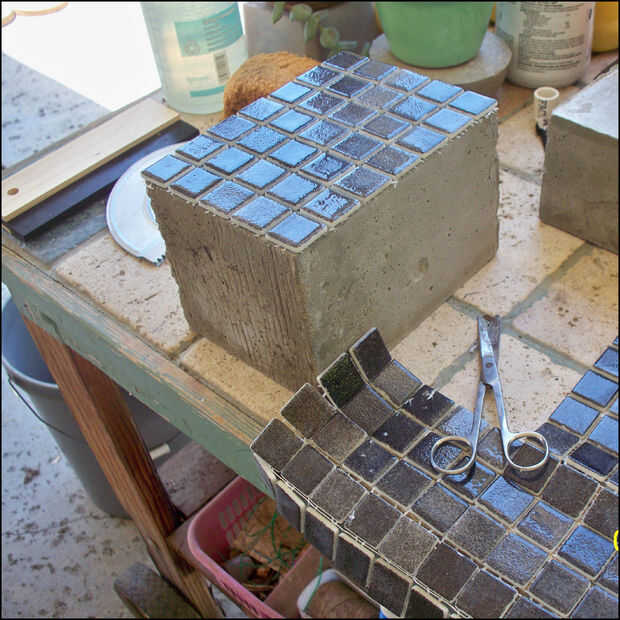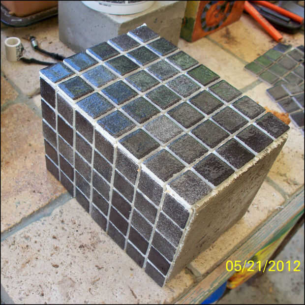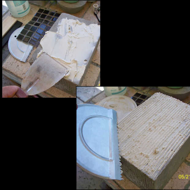 he utilizado adhesivo regular para fijar la baldosa a lo concreto.  Siguiendo las indicaciones del fabricante, extienda el adhesivo con la herramienta esparcidor que se muestra.  Cortar azulejos para montar los espacios y en su lugar.  Cubrir la pieza según sea necesario, luego de la lechada.