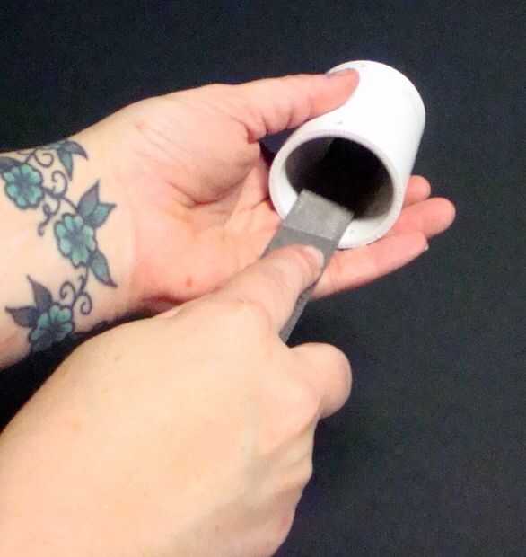 Después de todas sus piezas se necesita limar los cantos interiores de los acopladores. Accesorios de PVC tienen rebordes interiores que para el correspondiente tamaño de tubería de ir demasiado lejos, pero queremos los acopladores que conforman la porción de la pulsera de la plantilla y el mandril cabeza de turcos se deslice fácilmente arriba y abajo de la longitud de la columna vertebral. Usando una escofina o una Dremel con un tambor de lijar que ir a la ciudad en las cordilleras. Según la facilidad que desee su plantilla de diapositiva, puede enrarecer los acopladores un poco ahora también.