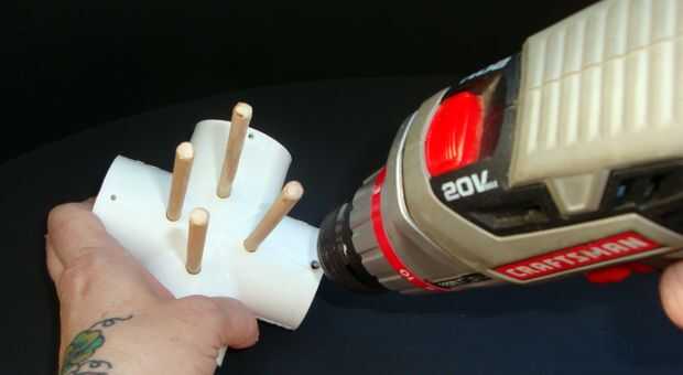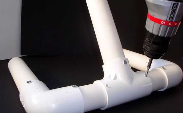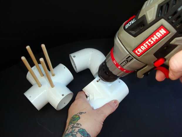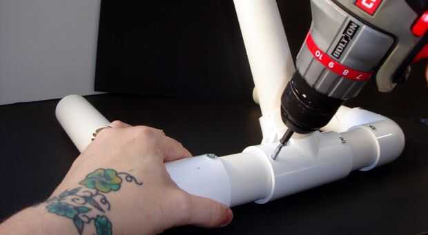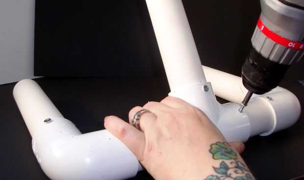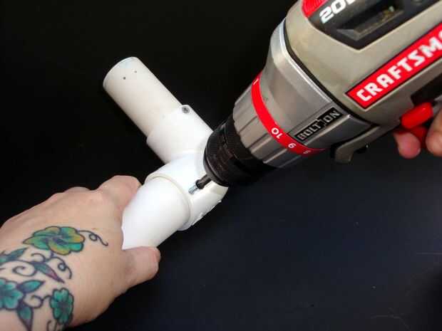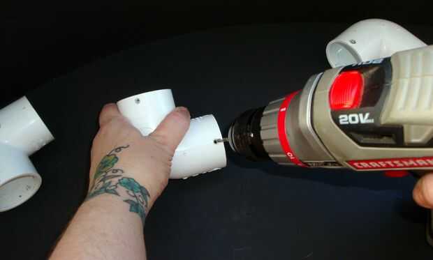 Conjunto es súper fácil! Simplemente se va a tomar la PVC 8" y con un destornillador, inserte un tornillo en el orificio piloto previamente perforado y fije el PVC de 8" para el codo de 90 grados. Hacer lo mismo para el segundo lado.
