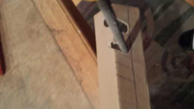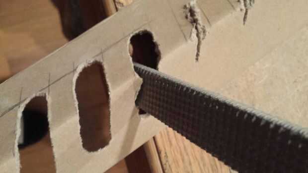 Recomienda: cuando corte hacia arriba y hacia abajo, trate de no cortar en ángulo. ser lo más recto hacia arriba y hacia abajo como sea posible. Primero cortar, con la lima gruesa redonda, corte horizontal a la mesa hasta que se rompe a través de la cartulina. En este punto, aún utilizando la lima redonda, corte vertical para limpiar entre las líneas que hiciste y a unos 5/8 de pulgada de la base de la cartulina. Ahora la plataforma debería verse como cuadro 3 en el paso. Utilice una lima plana gruesa incluso a los lados y hacer las líneas lo más recto posible. Limpie los bordes redondos con una lima redonda fina.