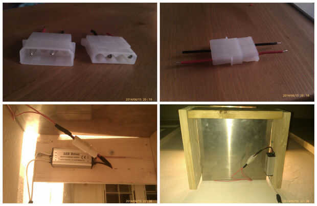Instale el conductor llevado (eBay) en el balcón con los 4 conectores molex. Tuve varios de estos poniendo en mis cajones de piezas. generalmente vienen con ventiladores de computadora u otras piezas de equipo del mercado que ha adquirido previamente. O puede utilizar puertos usb hembra/macho como en la mayoría de mis otros proyectos.