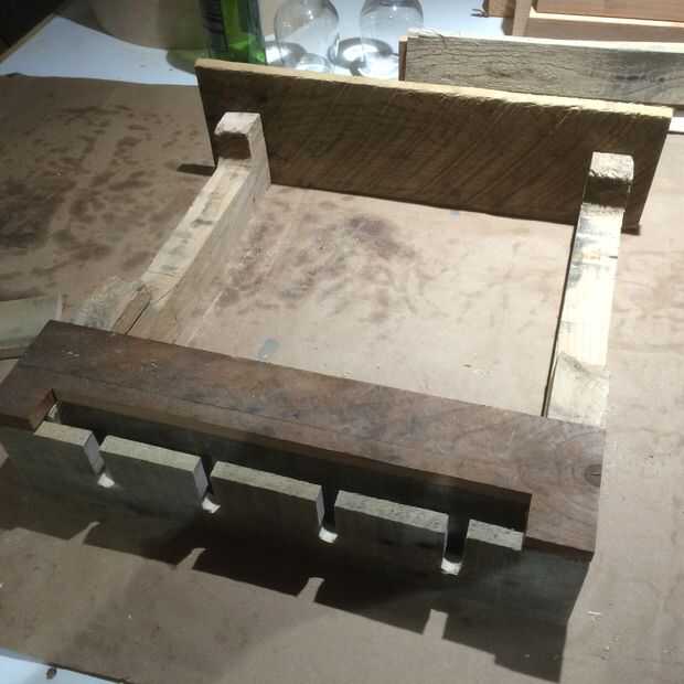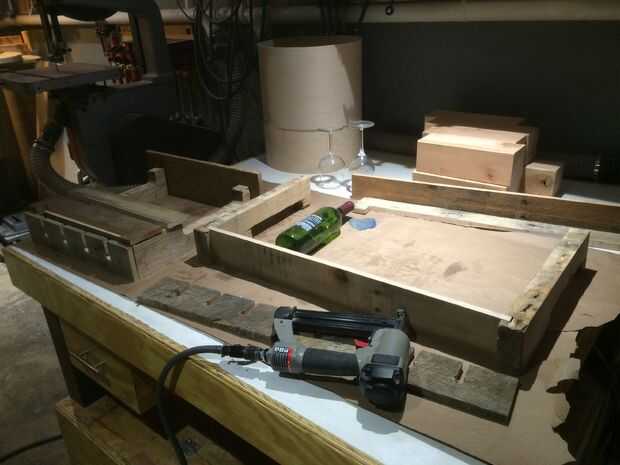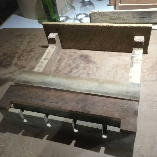 La botella que tenía era de 3" de diámetro. Quería espacio para 4 botellas, así que fui con una 13" dimensión interna, que determina la longitud de la plataforma cautiva, el estante de cristal y todos los listones. Dependiendo de la profundidad de sus mortajas y la anchura de los listones, las medidas pueden diferir. Que he enumerado mis dimensiones al final de este instructivo.