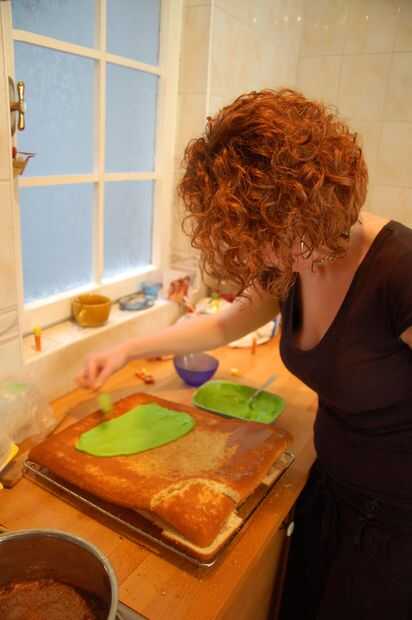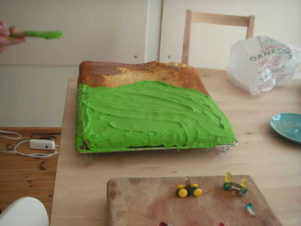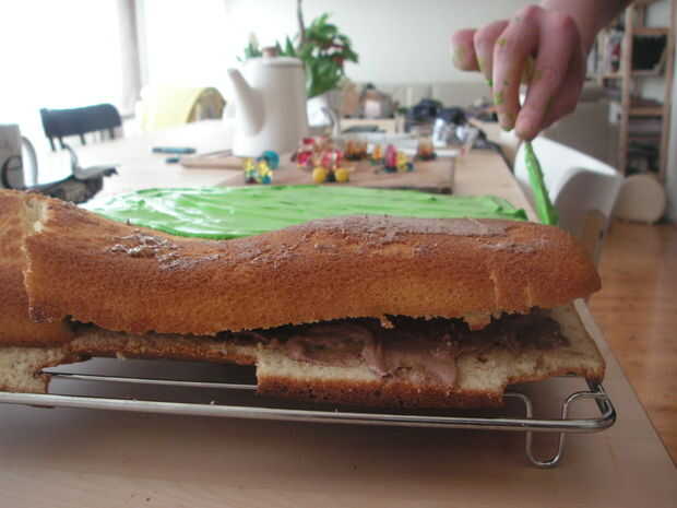 Preparar la crema batida, mezcle un tercio de la misma con amarillo y dos tercios con verde/azul para hacer el lado del agua. y comienzan a cubrir la torta. Cubrimos un tercio con amarillo es la playa y el resto verde/azul como el lago.