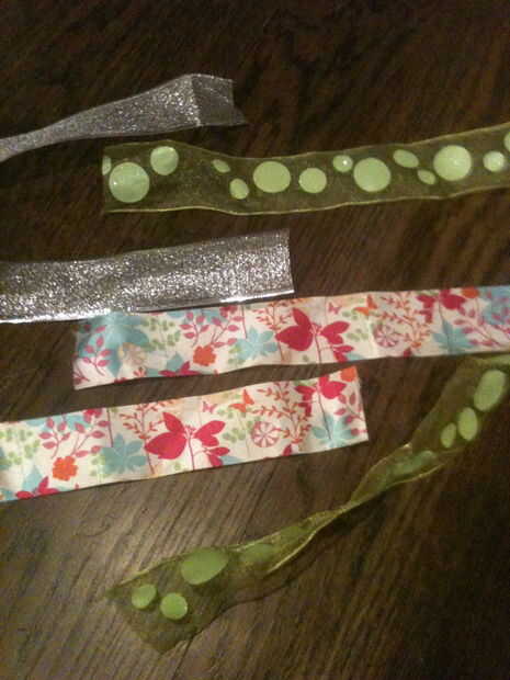 Salir de sus tres tipos de cinta (usted puede elegir cualquier color o patrón desea, recuerde que la cinta que todos complementan mutuamente). A continuación, cortar 16 pulgadas de largo cada una. Después de eso, cada uno de los 3 trozos de cinta de corte a la mitad. Ahora tiene un total de 6 pedazos de cinta cada 8 pulgadas de largo. Luego, los ponen todos uno encima del otro (está bien si las cintas son de diferentes anchos).