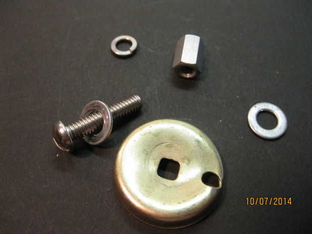 Ahora quería instalar los resortes y ver cómo todo encajaría. Los tres muelles más grandes utilizan una placa base desmontable con un agujero para un tornillo de montaje. Os adjunto las placas base a la tapa de la caja con hardware reciclado. La primavera más pequeño tiene un tornillo incorporado en la base. Puse esto a través del agujero en la tapa de la caja y para atornillar un disco de madera contrachapada firmemente desde el interior para sujetar el resorte pequeño en su lugar.