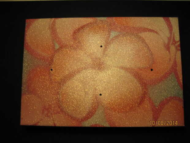 Yo quería pintar la caja por lo que yo le di un buen lijado para ayudar a la memoria de la pintura. Limpié la superficie de la caja con alcohol y deje que se seque. Dieron la parte inferior del cuadro de varias capas de pintura negra satinada. Dio la tapa una capa base de plata metálica, seguido por un par de capas de pintura glitter Plata. Cuando este seco apliqué la plantilla de plumeria de mi tutorial de plantilla en tonos de rosa. Terminé con una capa de brillo de oro y varias capas de barniz transparente.