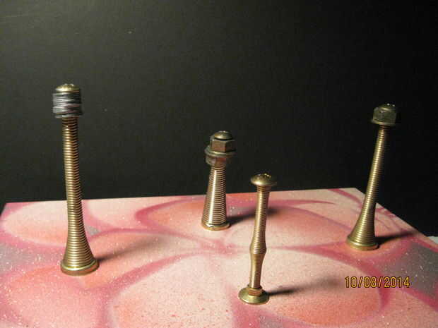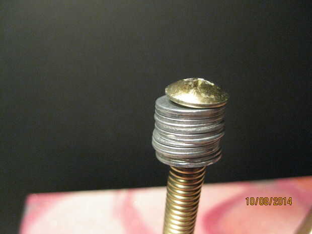 Mientras que pinté pensé en la tapa. Me paso a ver un paquete de arte adhesivo espuma letras en el estante en mi tienda y que me dio la solución. Solía arte espuma y cinta echada a un lado de la alfombra dos para hacer una Junta de tapa simple para evitar el traqueteo. También pensé en cómo alterar las calidades sonic de los resortes. Por supuesto las propiedades sonic estaban ligadas a las características físicas de la primavera. En este caso el resorte hace pivotar hacia adelante y hacia atrás como un péndulo. Este movimiento rápido y hacia atrás, o la oscilación, es lo que produce el sonido. Cambiando la velocidad o la frecuencia de oscilación podemos cambiar el sonido que produce. Puesto que nuestra primavera actúa básicamente como un péndulo, permite comenzar allí. La velocidad de un péndulo depende de la longitud del brazo y el peso. Cualquiera de esos valores será cambiar la velocidad de la péndola. Decidí que añadir peso al final de la primavera era un buen lugar para empezar.