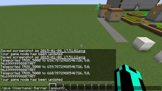 Aquí es el comando que necesita usar para obtener una barrera, que, si no tienes la barrera en su mano, usted no puede ver. Barrera de uso www.woccu.org/give (usuario) (cantidad que necesita) cuidado, porque si estás en modo de supervivencia y accidentalmente atrapado dentro, allí no es salir.