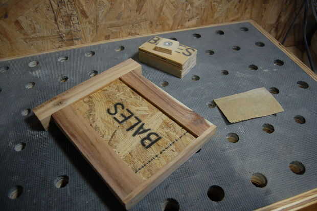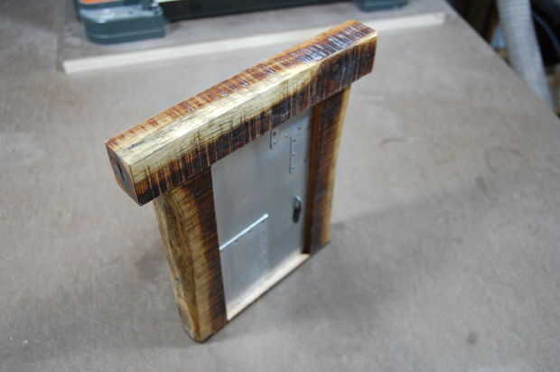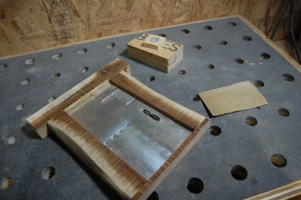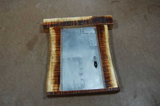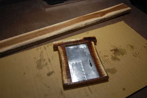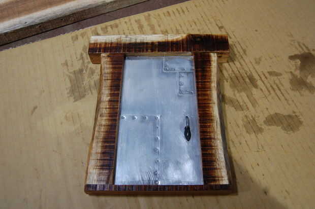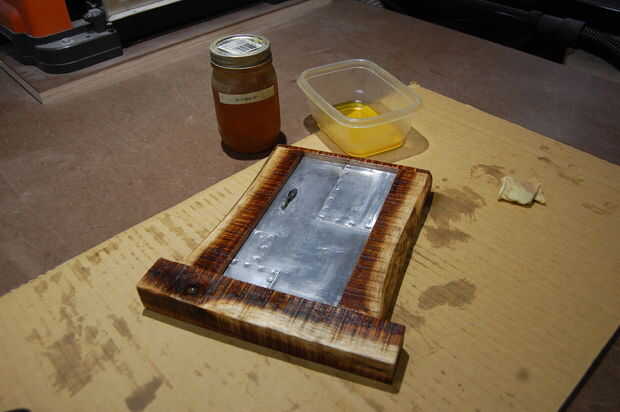 Lijar todas las superficies de madera hasta 150 grano usando un bloque de lijar para toda superficie plana y mano lijado para romper todos los bordes duros. Usé grano 220 en la puerta de metal. Lijando suavemente el metal había añadido ligeros rayones y había quitado algunos oxidación de la superficie de puntos altos. Realmente ayudó a cierta definición a las cabezas de los clavos... y ayudó a ocultar mis rasguños de cincel.