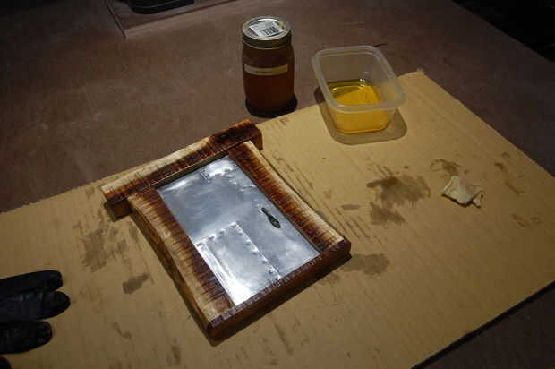 Para el acabado de la madera, usé los espíritus de mineral aceite de linaza cocido 50/50. Fue seguido por tres aplicaciones de la capa transparente sobre toda la pieza. El puede no especifica lo que es, pero es probablemente algún tipo de esmalte acrílico.