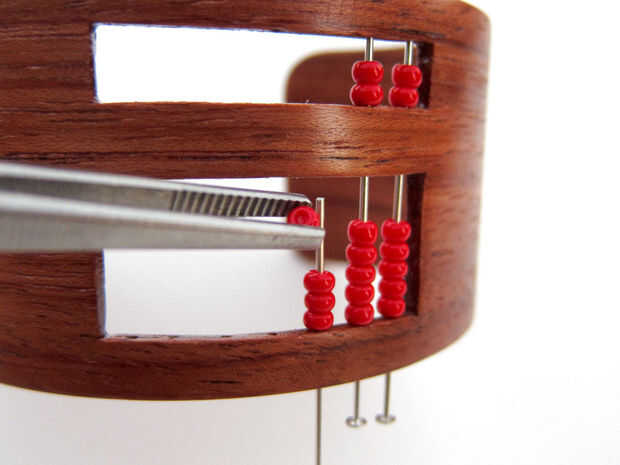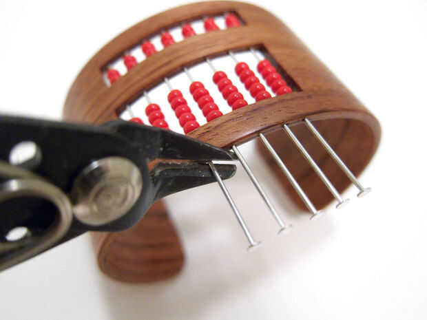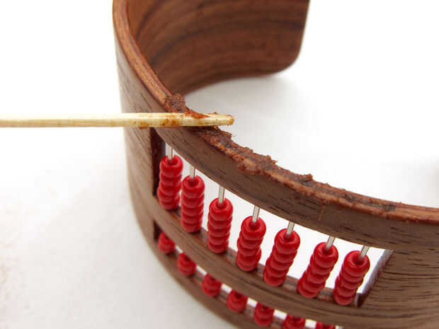 Para rellenar los agujeros, unas tiras de chapa de arena y salvar el serrín. Mezcla con pegamento para obtener una pasta, luego presione la pasta en cada orificio con un palillo de dientes, pequeño trozo de madera o incluso un perno de cabeza extra. Uso de aserrín de la madera misma como la pulsera hará los agujeros llenados casi invisible. Cuando se seca el pegamento, pulir los bordes así que el resto de pegamento sólo en los agujeros. Aplicar una capa de acabado a los bordes, asegurándose de no sale nada en las cuentas y deje que se seque.