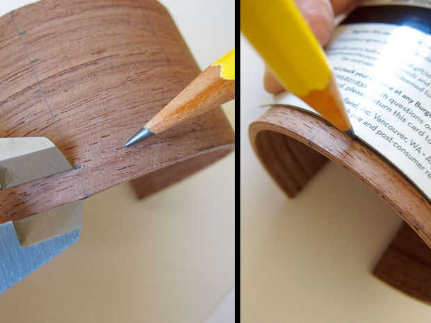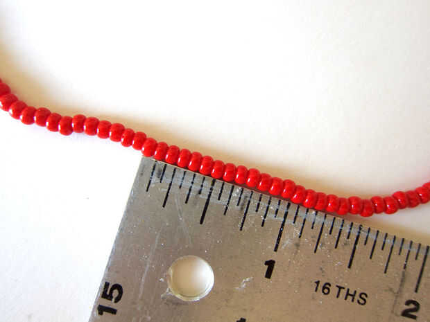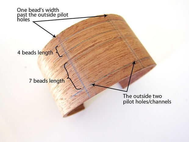 Medir a distancia de cada lado y marca con un lápiz. Añadir la longitud de los 7 granos y marque allí. Desde el otro lado, añadir la longitud de los 4 granos. Utilice una regla flexible o una tarjeta de crédito para dibujar líneas rectas en la curva de la pulsera.