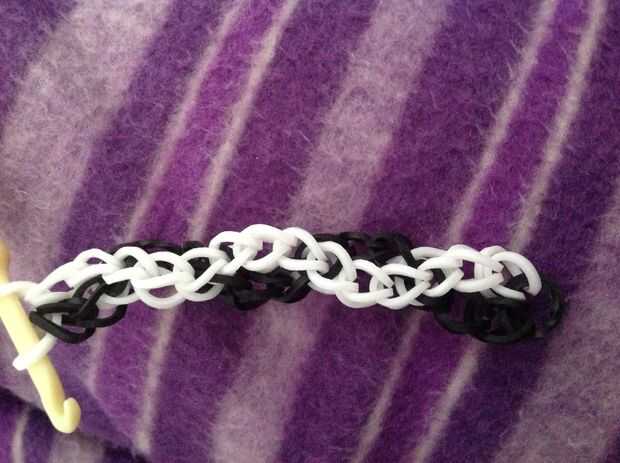 Esta pulsera consiste en tres círculos que han sido ganchillo juntos. Utiliza el mismo principio utilizado para tejer de mobius, pero normalmente siete anillos se unen de esta manera tejiendo unos en los otros una vez. Para esta pulsera, tejió los cí