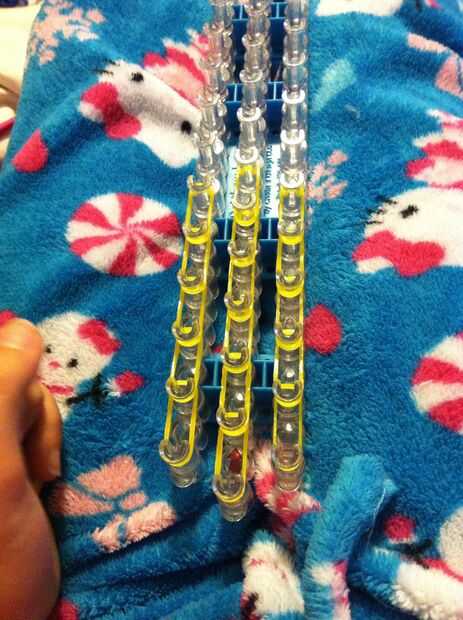 Primero poner algunas bandas de goma amarillas en el telar y doble las bandas.