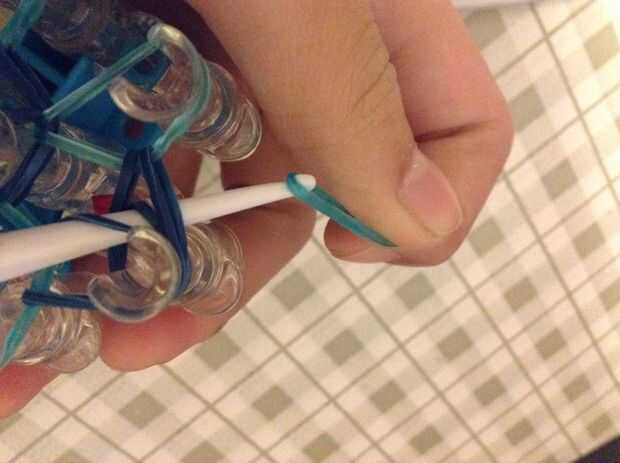 Ahora llegar a la banda de goma superior y colocar una banda de goma en el gancho. Luego tire la goma para que la goma está en la banda de goma está en la mitad y la mitad hacia fuera.