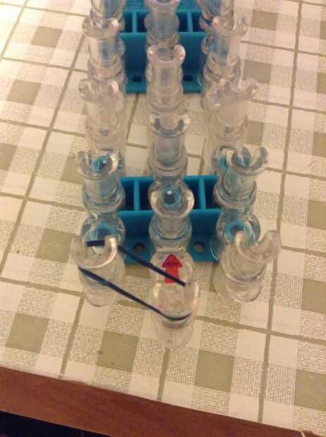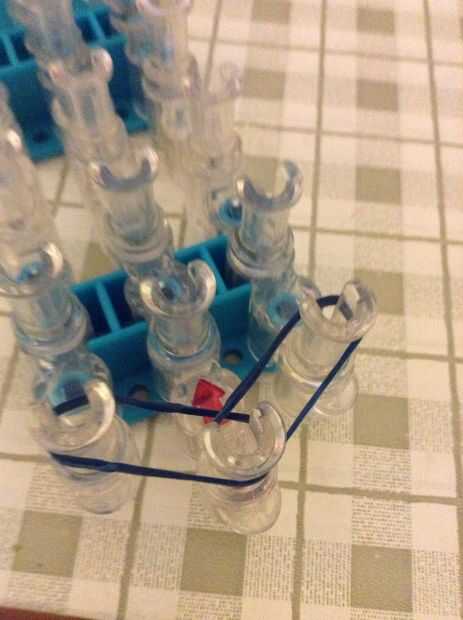 Asegúrese de que (si estás usando el telar del arco iris) su flecha apunta lejos de ti! Coloque su primera banda de arco iris de la clavija de la parte inferior de la fila central a la clavija de la parte inferior de la fila izquierda. Hacer lo mismo a la derecha!