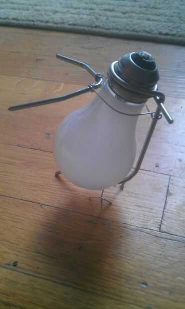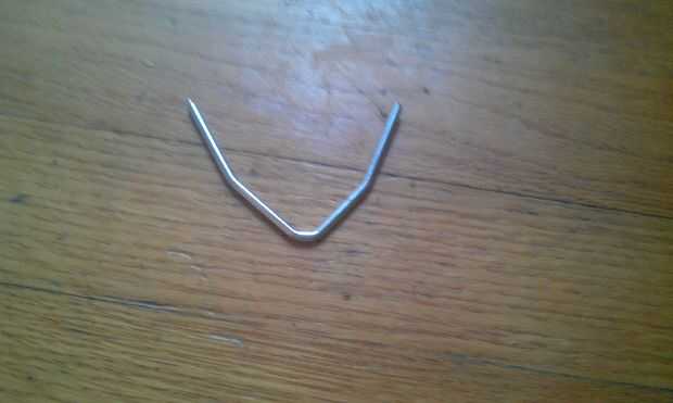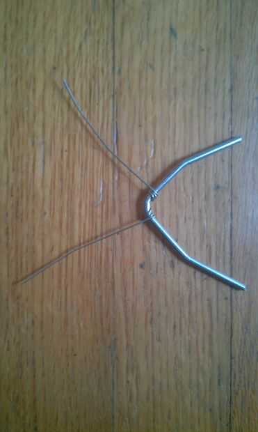 Doblar la parte de la barra de soldadura ha cortado (si el no es suficiente entonces uso su "mente") por la mitad para formar una forma de 'V'. A continuación, utilizando pinzas, envuelva a clips de papel como de wat se muestra en la foto para hacer una forma de 'X'. Esta parte será la estructura principal del "hueso" de las alas. Entonces tuerza los extremos de los clips hasta que las "alas" ajustadas la bombilla. Envuelva la parte que solo trenzado alrededor de la varilla de soldadura (Foto 3).