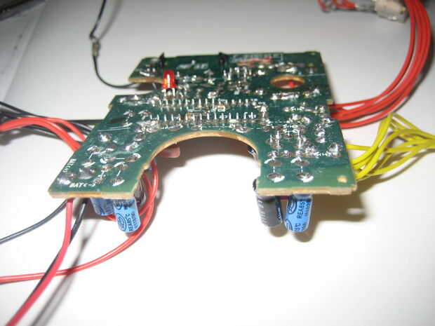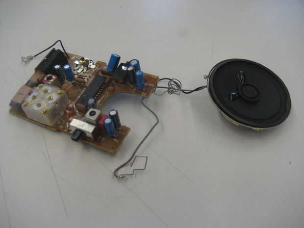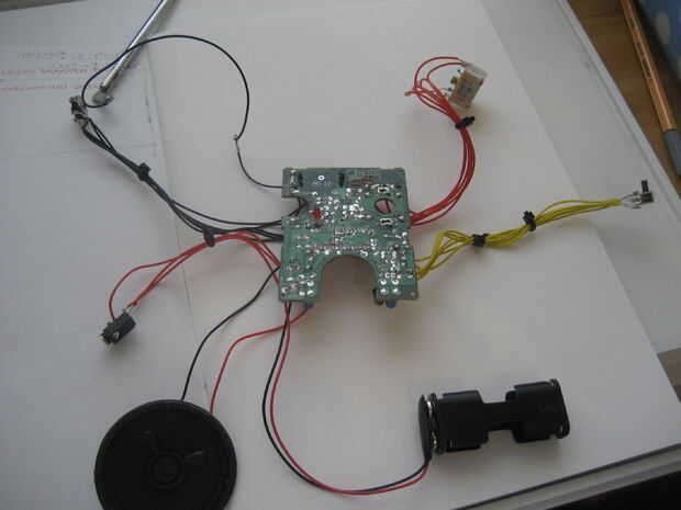 En orden para la placa de circuito encajar en mi diseño tengo que recablear y mover algunos de los componentes. Tenía que mover el sintonizador de FM, auriculares, / AM interruptor y encendido/apagado y volumen control cog. Éstos fueron quitados mis desoldar las partes pertinentes para la parte saldría de la placa de circuito principal. Los cables fueron entonces soldados sobre el componente y luego en el agujero correspondiente en el circuito. Alargamiento de los componentes de la placa de circuito les permitió caber en mi idea inicial para la radio.