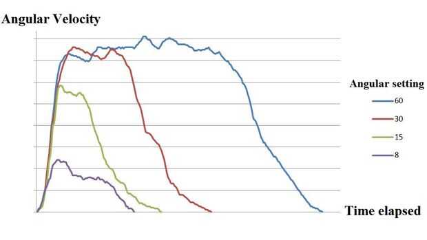 En la figura anterior muestra el cambio en la velocidad angular de un Servo Motor de principio a fin. Diferentes ángulos hay cuatro con 8, 15, 30 y 60 grados reciben y cuatro líneas en esta figura representan estos ángulos respectivamente. La pendiente de cada línea muestra una aceleración angular. Podemos conocer la aceleración de arranque y desaceleración hasta parar. Así que la figura nos dice lo siguiente.