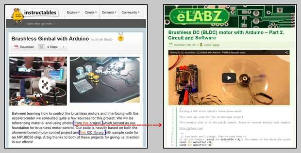 Por otro lado no se utilizaría ningún dispositivo especial en este proyecto como se describe en la Introducción. Sólo Arduino puede usarse para controlar el cardán. Por lo tanto, me centré en un artículo raro en Instructables en la que se utiliza ni ESC ni Controlador de cardán . Su título "Cardán sin escobillas con Arduino" llega a la marca de mi proyecto. Pero es una lástima que el cardán que se muestra en la parece no funcionar adecuadamente por lo que dicen los autores, "que nunca conseguimos el cardán que estábamos buscando".