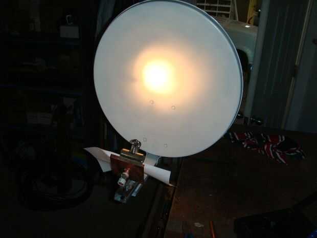 He utilizado una linterna apuntada con el ángulo que quería. Conecta luego un pedazo de papel en el reflector e intentado conseguir muerto por. Me dio un 2" círculo de luz para trabajar con. Ahora creo que hay mucho sucediendo aquí, no sólo está este plato diseñado para un uso distinto, pero también una antena diferente. LNB son sobre todo cantenna en diseño, por lo que trajo el bi-quad un poco más.