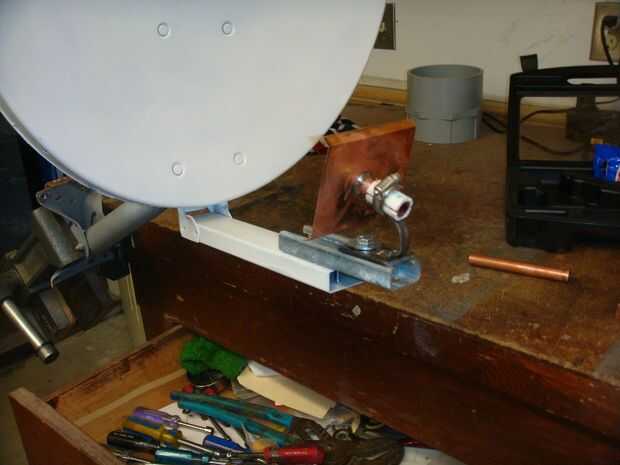 Ya pinté blanco, es reflexivo. Si usted no lo quiere blanco, cubierta en papel de aluminio. O utilizar álgebra para averiguar el lugar correcto, Busque aquí. Si tienes suerte, el plato que va a utilizar tendrá un LNB y puede ir desde allí.