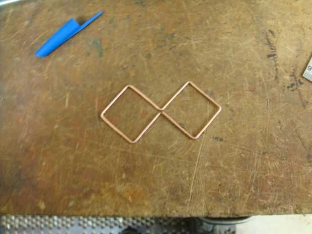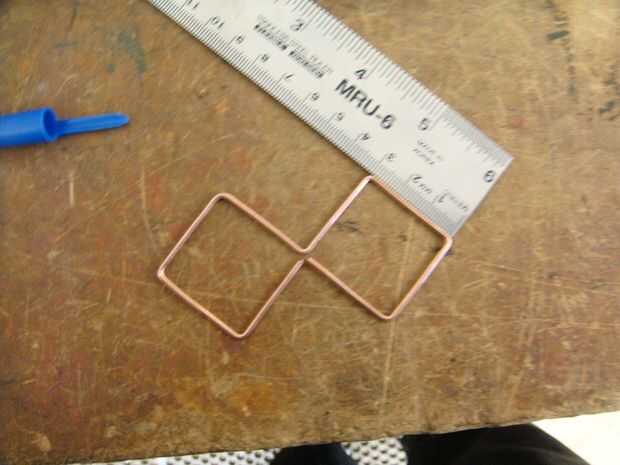 Sea paciente, cortar un trozo de alambre, usé un 14g cobre sólido que es de 1,6 mm. En la investigación de esto, he encontrado el tamaño sí importa ;) 1.2mm es preferible. El más grueso el cable cuanto mayor sea el ancho de banda de la antena. Primero enderezar luego cortarlo exactamente 244mm. Medir y marcar en 122 m m, 90 grados de la curva. Desde el centro del alambre medida 30,5 .75mm marca y curva. Hacer esto a cada lado hasta llegar a lo que en la foto. Dos elementos quads. Cada vestido es una onda de 1/4 de 2,4 GHz. Bueno entender esta cosa de Hertz que probar aquí.