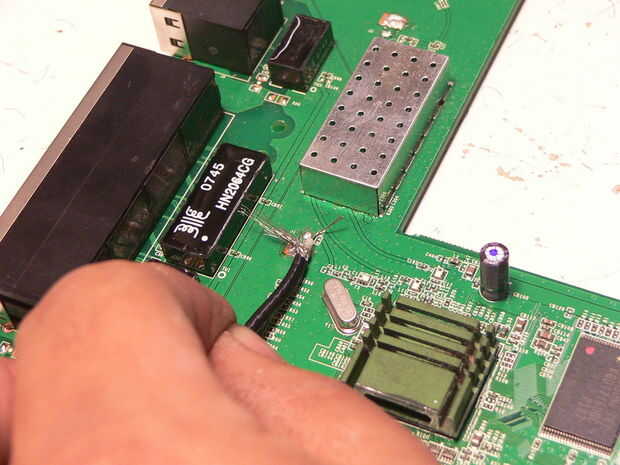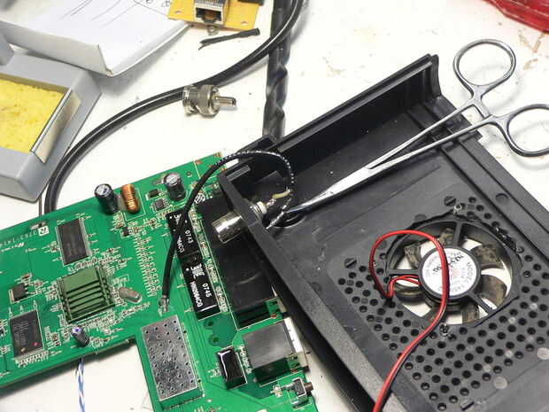 Solider dos 3"- 4" colas en la placa principal donde estaban las antenas anteriores. Asegúrese de que ninguno de la trenza en contacto a la base. Puede ser un trabajo firmemente.