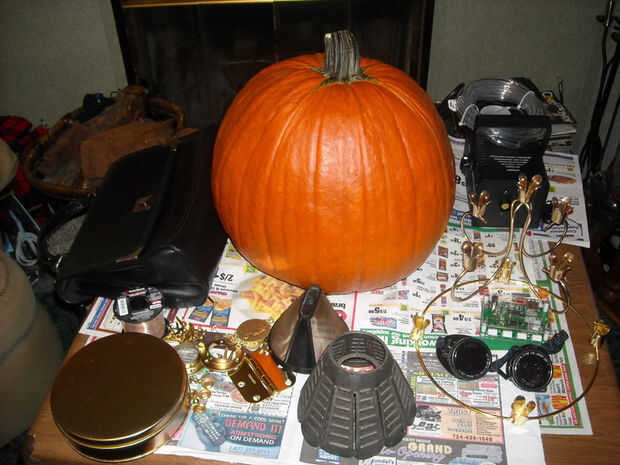 De alrededor de la casa recoger materiales para darles un nuevo propósito para decorar la calabaza. Encontré un viejo bolso con algunos bucles de latón, cadena de oro y cubierto de cuero falso. También conseguí una pantalla, cubre de perilla de puerta, bisagra de la puerta, palo sostenedor de vela y algunos clavos de latón para unir cosas.
