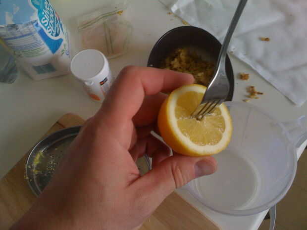Para el jugo de limón, utilizar el siguiente método. Canilla en el microondas durante unos 10 segundos. Probablemente no incluso es caliente al tacto. Cortar por la mitad y meter un tenedor en ella. Horquilla de torsión y a salir mucho más zumo (porque el microondas es la estructura interna del limón rompiendo que supongo). También había rallado un poco de piel (la piel - sólo el amarillo poco) en la pila de jengibre. Poner una medida de limón en el agua. Utilizo una cucharadita o dos.