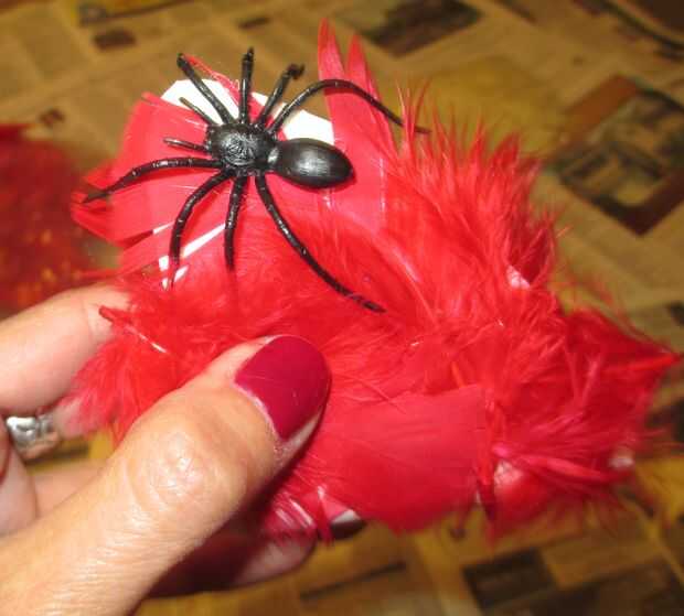 Ahora es el momento para pegar las plumas y las arañas. Me aseguro de mantener todo firmemente en su lugar mientras el pegamento seca. No quiero nada caerse cuando el auricular se pone en movimiento.