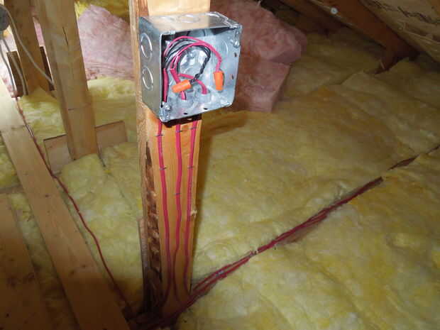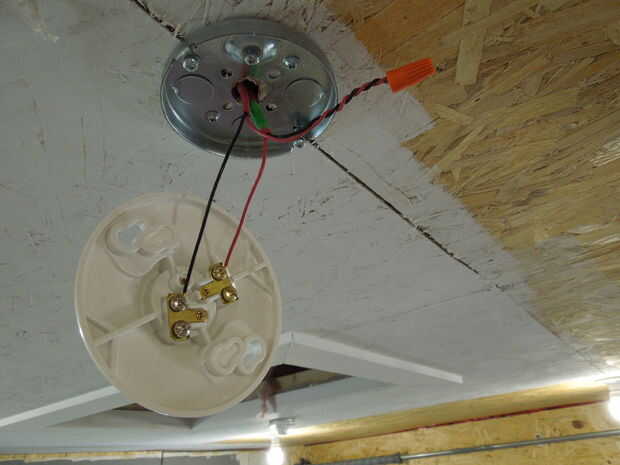 En la segunda imagen veis el accesorio para la luz de estado de ánimo. El cable de alimentación procedente de la caja de ensambladura del ático es la sin la cinta adhesiva verde en ella. El cable con la cinta adhesiva verde sale al interruptor. La manera que esto está cableado permite el cable positivo de la alimentación para ser alimentados al interruptor antes de vuelva para encender la bombilla. Este tipo de cableado se llama un "lazo vivo" y es común en circuitos de iluminación de la casa de 120V CA.