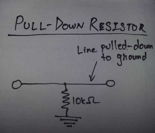 -De manera similar, cualquier línea en el circuito digital puede ser tirado hacia abajo a nivel bajo (masa - 0V) usando un resistor de pull-down.