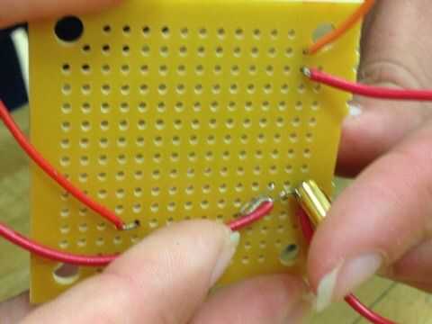 Soldar el sensor de la inclinación a la Junta; la pata corta del sensor de inclinación debe ser soldadura junto a la primera final del primera alambre soldado en el paso anterior. Estos cables deben tocar. Luego de la soldadura de la segunda etapa del sensor de la inclinación al lado el alambre puente 3, que debe ser relativamente cercano bajo el puente de alambre 1. DEBEN tocar el cable puente 3 y la segunda etapa del sensor de la inclinación.