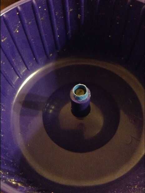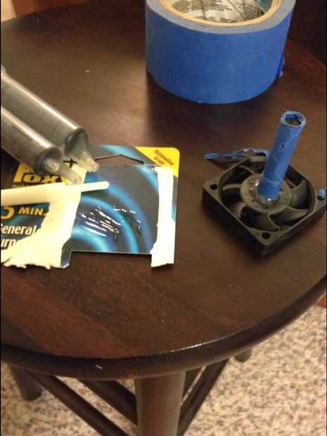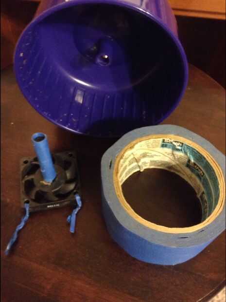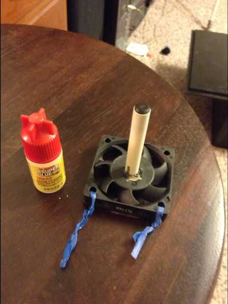 El siguiente paso es pegar el nuevo eje sobre el ventilador.  Encontrar el centro del ventilador y después de usar un papel de lija o un archivo para áspero el ventilador usar superglue para pegar el eje en las aspas del ventilador (Foto 1).  Luego, envolver el eje con cinta adhesiva o cinta adhesiva (2) hasta que encaje perfectamente en la rueda de hámster (3).  Después de todo eso, usted puede agregar algunos epoxy de 5 minutos para la fuerza adicional (4).