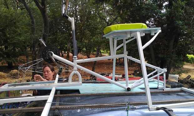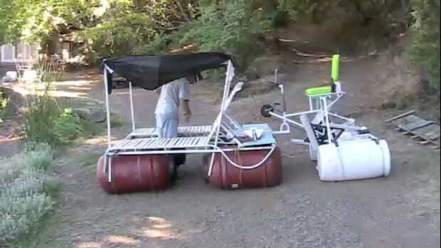 He añadido un conjunto de pedales y un anillo de cadena delantero a la parte delantera de una bicicleta vieja de un contenedor de basura. Como una comodidad para pedalear semiacostada, alargó el vástago del manillar para hacer espacio para las rodillas. Una estructura de soporte debajo del asiento crea un espacio para un par de barriles para flotar a la persona pedalea y manejo del latigazo y un estante multiuso soldado con autógena a la horquilla delantera proporciona una estructura para pestañas todo a salones de la calesa, pequeñas embarcaciones o incluso un muelle flotante.