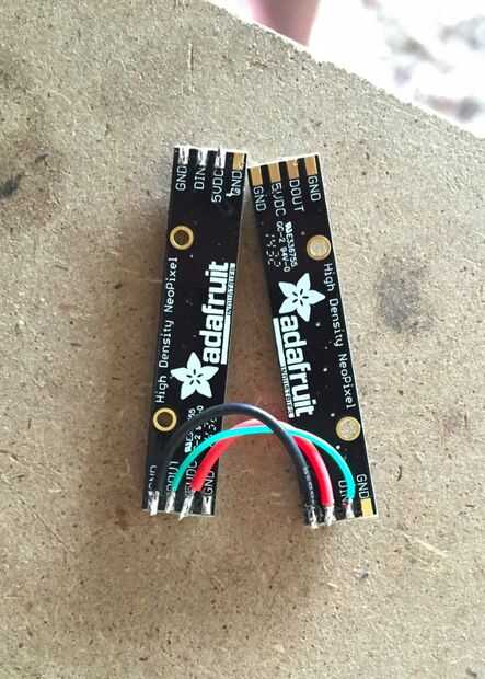 Los faros son dos 8-Neopixel tiras montadas de lado, pero conectados digitalmente para aparecer como una sola tira de 16 píxeles. Soldado las dos tiras juntas y el cable de 3 pines JST enrutadas a través del cuerpo, antes de montar con el hardware de tornillo.