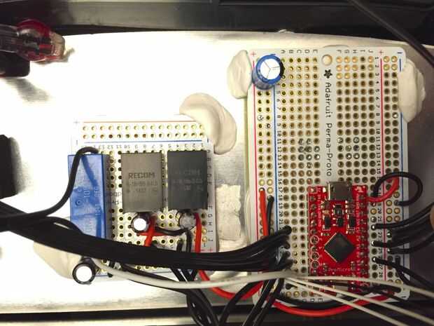 Regreso de la Sugru! Puesto que este material milagro es flexible (dimensionalmente estable) y aislar eléctricamente, su verdad es una buena y rápida solución a nuestro problema de montaje PCB. Hice unas bolas de Sugru debajo de los PCB para asegurar suficiente espacio separador para prevenir cortocircuitos contra la placa de base metálica y a unos soportes de esquina para la estabilidad.