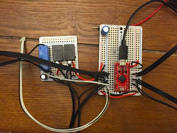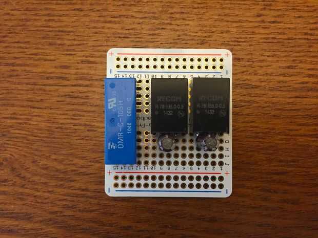 El uso del relé mecánico aislado era algo perezoso. Buscaba la forma más sencilla de conectar los dos cables de alimentación OEM, sin pasar ningún tiempo averiguar la tensión, dirección de la corriente o saturación de puerta necesaria para utilizar un FET. Me encontré con un relé de 5v en un RadioShack local (pronto a ser extintos) que encajan muy bien esta necesidad. Tiene 5v 20mA activación actual y puede cambiar hasta 1A 250V. A pesar de que este es un pequeño relé y bobina, yo preventivamente también dispone de un diodo flyback a través de los cables de la bobina para disipar exceso EMF.