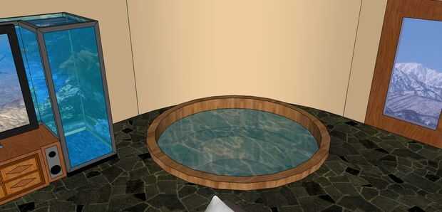 las paredes son de color azules con rayas verde neón que brillan. El piso es de alfombra fina que es negro y el techo sería neón rojo con puntos blancos y negros que hacen un destello.