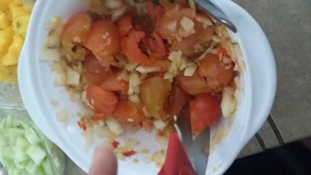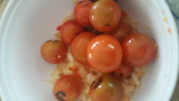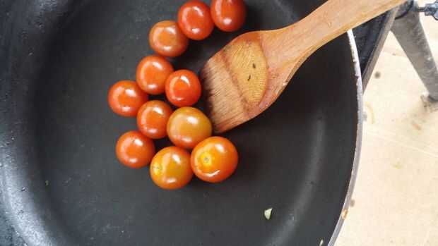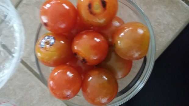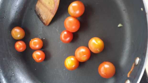 Calentar la estufa a fuego medio. Añadir los diez tomates cherry en una sartén, sin aceite requerido. Revolver alrededor suavemente hasta que el color se convierte en brillante y la piel comienza a quemarse. Una vez se calientan, ponerlos en el recipiente del medio mismo que tienes tu mezcla ajo, pimientos y cebollas en.