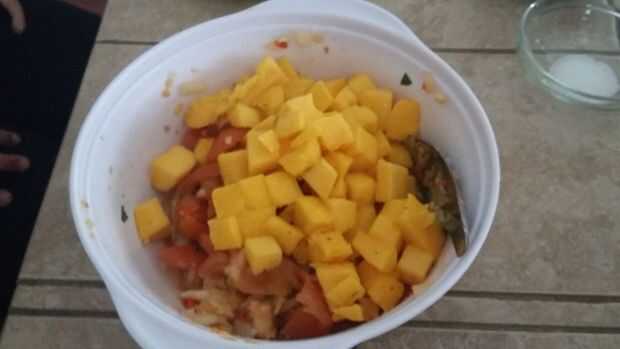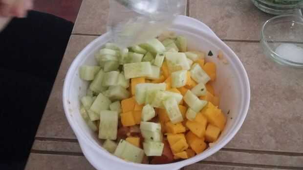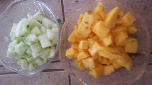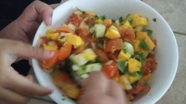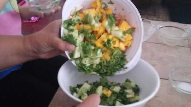 Agregar el mango en cubos sobre el recipiente de mezcla de ingredientes, luego añadir los pepinos en cuadritos. A continuación, añadir el cilantro picado y mezclar lentamente los ingredientes para que combina agradable y colorido.