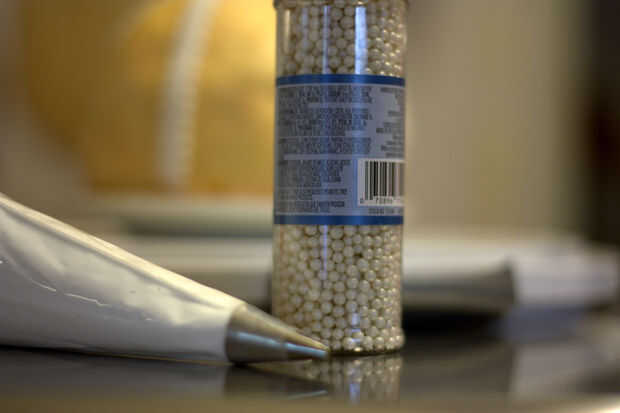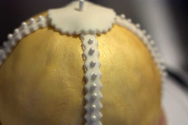 Extienda algunos (fondant) blanco.  Cortar tiras para adornar la Santa Granada de mano, como se muestra.  Usted puede cortar con un cortador de pizza o un cortador de pasta de azúcar que le da un borde rizado.  Puede que necesite mojar la parte posterior de la pasta de azúcar que palillo tenga cuidado sin embargo, un poco de agua va una manera larga.  Ahora corte un pequeño círculo para cubrir las juntas en la parte superior la Santa Granada de mano.  Para un broche de oro extra Coloque las perlas de azúcar a la cinta blanca con glaseado real.