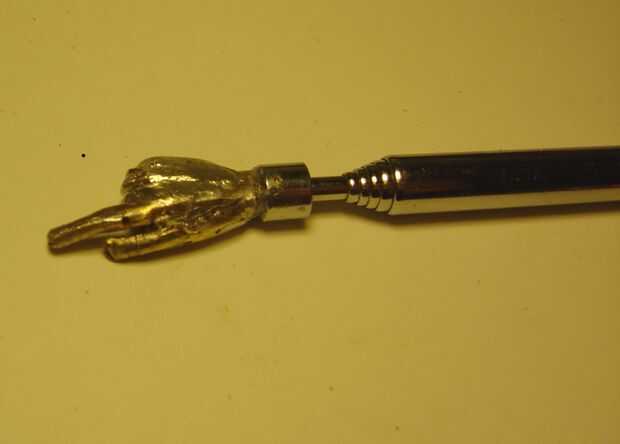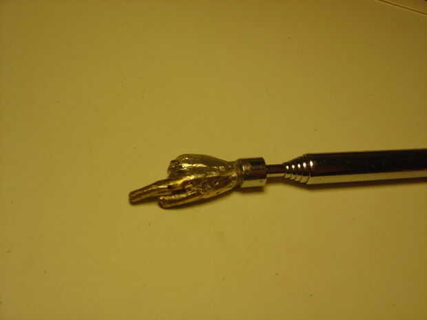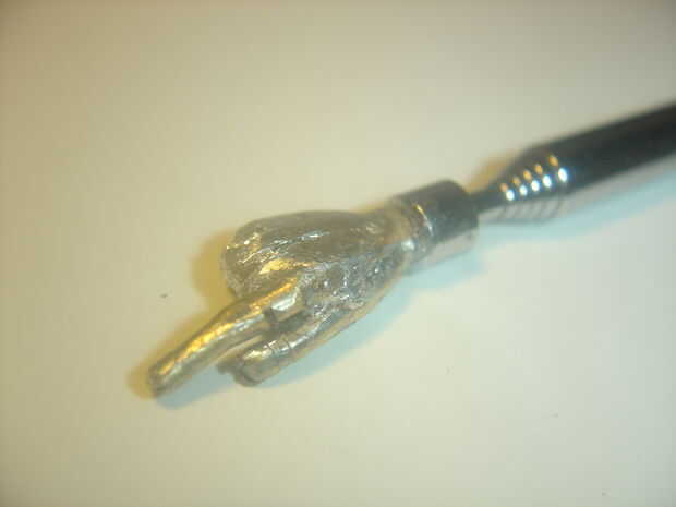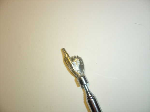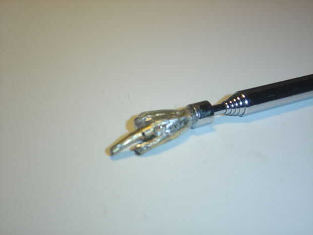 Centro de la muñeca de la mano sobre la punta de la antena y pegamento estupendo en el lugar. Espere que se seque completamente antes de señalar.