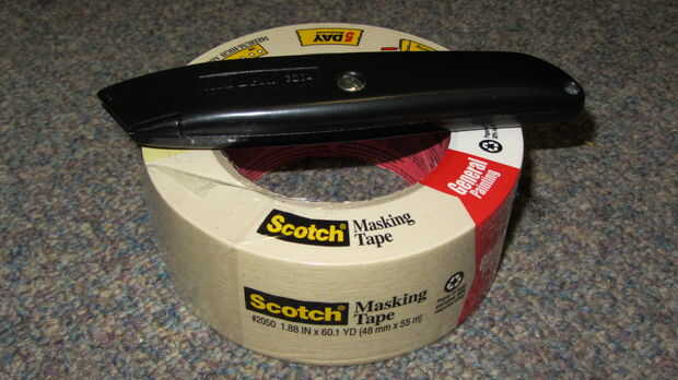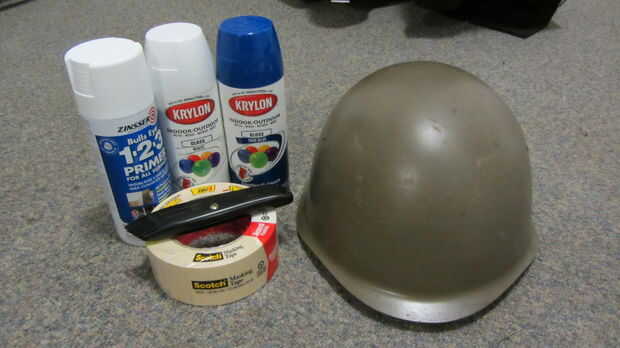Casco (tiendas de excedentes o donde usted puede encontrar) Pintura en aerosol 1. la cartilla 2. azul 3. blanco Scotch cinta de pintura Cuchillo para uso general