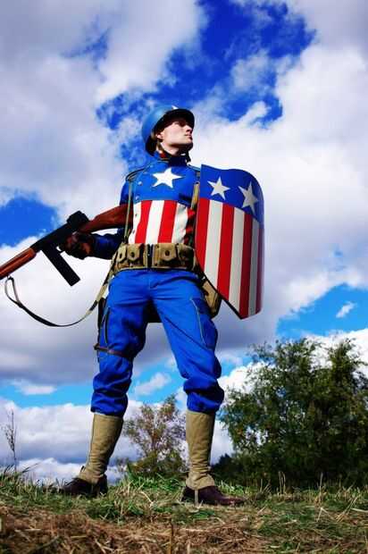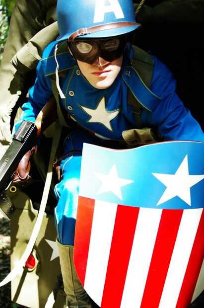 esto se basa en una versión cómic de traje del Capitán América WWII a excepción del escudo que se hace después de la película uno ya parece más fresco. El traje está cosido desde cero utilizando lona y otros materiales que se asemejan a lo que habría sido utilizado. La única excepción es el ejército lona verde arnés que es engranaje real de guerra mundial 2 y Reenactor. El traje es alrededor tan auténtico como usted puede conseguir. El escudo está hecho de un techo de camiones de Ford de 59. Cortar, lijar, pintado, y respaldado por una capa de espuma densa y cubierto en cuero. Los mangos pueden desenganchar y estar amarrado a mi arnés puede usarse el escudo en la espalda. Thompson (pistola) es hecho de madera teñida y pintada con una correa unida. La máscara está hecha de piel artificial con natación gafas equipadas en su interior. El casco es real solo con unos tirantes quitado y pintado encima.