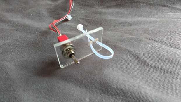 Esta parte es bastante abierta a la imaginación. Si usted tiene otra cinta de luz de bicicleta ahí, sería una solución limpia, no, así que sólo utilizamos una amarra y un pequeño cuadrado de plástico con un agujero de 5mm para fijar el interruptor, y atan dos agujeros pequeños juntos para la cremallera.