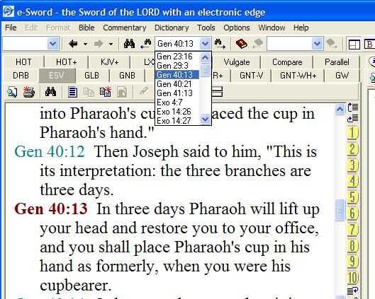 a menos que se puede leer la Septuaginta en griego, usted querrá examinar los resultados de la búsqueda en una versión en inglés. He seleccionado la versión estándar inglesa (ESV). Nota la ficha gris. Después de hacer clic en aceptar en el cuadro de búsqueda, los resultados aparecerán en la ventana pequeña entre los dos binoculares pequeños con flechas. Haga clic en uno de los pequeños prismáticos se moverá el resultado mostrado hacia adelante o hacia atrás un paso. También puede bajar la ventana y haga clic en una referencia a un pasaje. La ventana de visualización saltará a ese pasaje.
