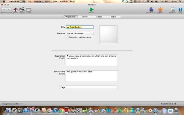 Proyecto Info ficha - en la ficha de información del proyecto, puede cambiar el nombre de usted la aplicación, elegir qué plataforma es para y también editar su descripción y cómo jugar.